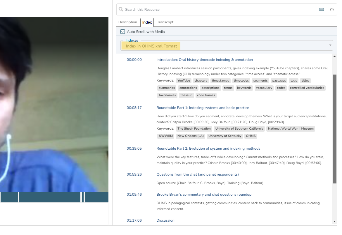 OHMS features a robust metadata scheme (OHMS.xml) for displaying indexed oral history content online. It can also be used to index other types of audio/video material, like OHA conference sessions. Explore the live version in Aviary.