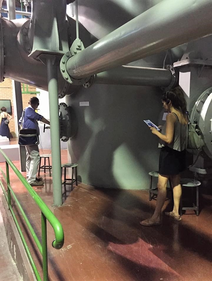 Exhibition visitors in two of the listening posts at the Industrial Gas Museum, Athens. Photo by Andromache Gazi.