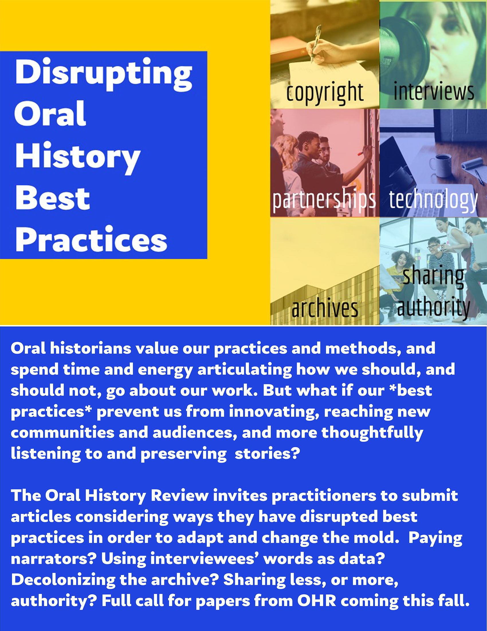We also have a booth in the exhibit hall, which will be accessed through PheedLoop (link and details forthcoming), where you will be able to find us and video chat, peruse our list of books available for review, pitch us your article ideas, and learn more about our forthcoming call for papers on “Disrupting Oral History Best Practices.” And yes, there will be prizes!